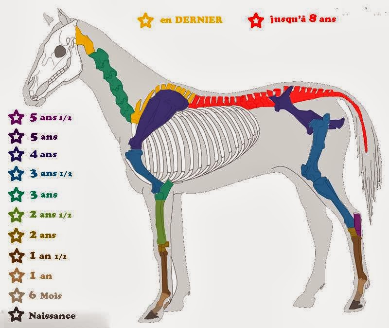 Le processus de conversion des cartilages de croissance en os se fait de bas en haut de l’animal. En d’autres mots, plus on descend vers les sabots, plus tôt la fusion des cartilages aura lieu & plus on se rapproche du dos de l’animal, plus cette fusion se fait tard. Le premier cartilage à s’ossifier, à la naissance, est la troisième phalange (os du pied). Dans l’ordre croissant viennent ensuite :